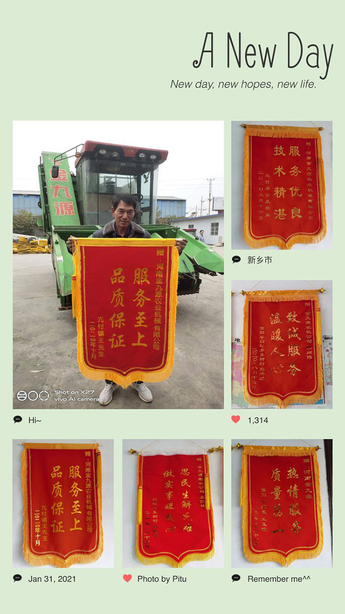 ? ? 2021牛年的腳步越來越近,河南金九源公司不負(fù)眾望,凝心聚力,傾情打造2021款穗莖兼收機(jī)!伴隨著公司成長的腳步,我們承載著太多的期待。心存感激,永續(xù)前行,我們會(huì)不斷創(chuàng)新、提升自我、打造精品、塑造品牌,一路與您同發(fā)展,共進(jìn)步,服務(wù)無止境,真情到永遠(yuǎn)!